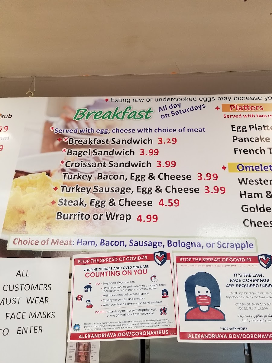 Choice of meat: sausage, bacon, turkey sausage with additional charge, turkey bacon with additional charge, ham, bologna or scrapple.